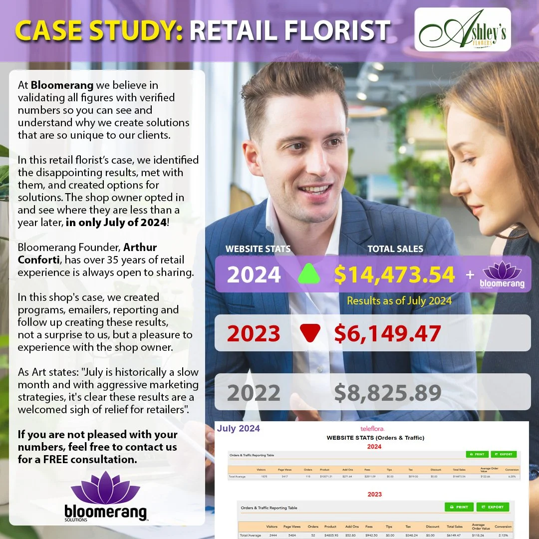 At Bloomerang Solutions, we believe in the power of data-driven strategies and verified results to drive success for our clients. This case study highlights the remarkable turnaround we achieved for Ashley's Flowers, a retail florist in Detroit, Michigan, by implementing tailored marketing solutions and strategic support.